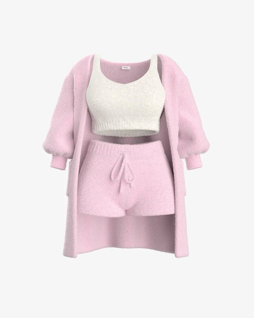 Varför nöja sig med det vanliga när du kan känna dig lyxigt mysig i dina pyjamasar? Tillverkad av ultramjukt bouclétyg är detta 3-delade stickade set som en varm kram du inte ens visste att du behövde. Oavsett om du slappar hemma, har en filmkväll eller bara njuter av en lat söndagsmorgon, ger detta set dig både stil och komfort.